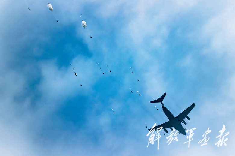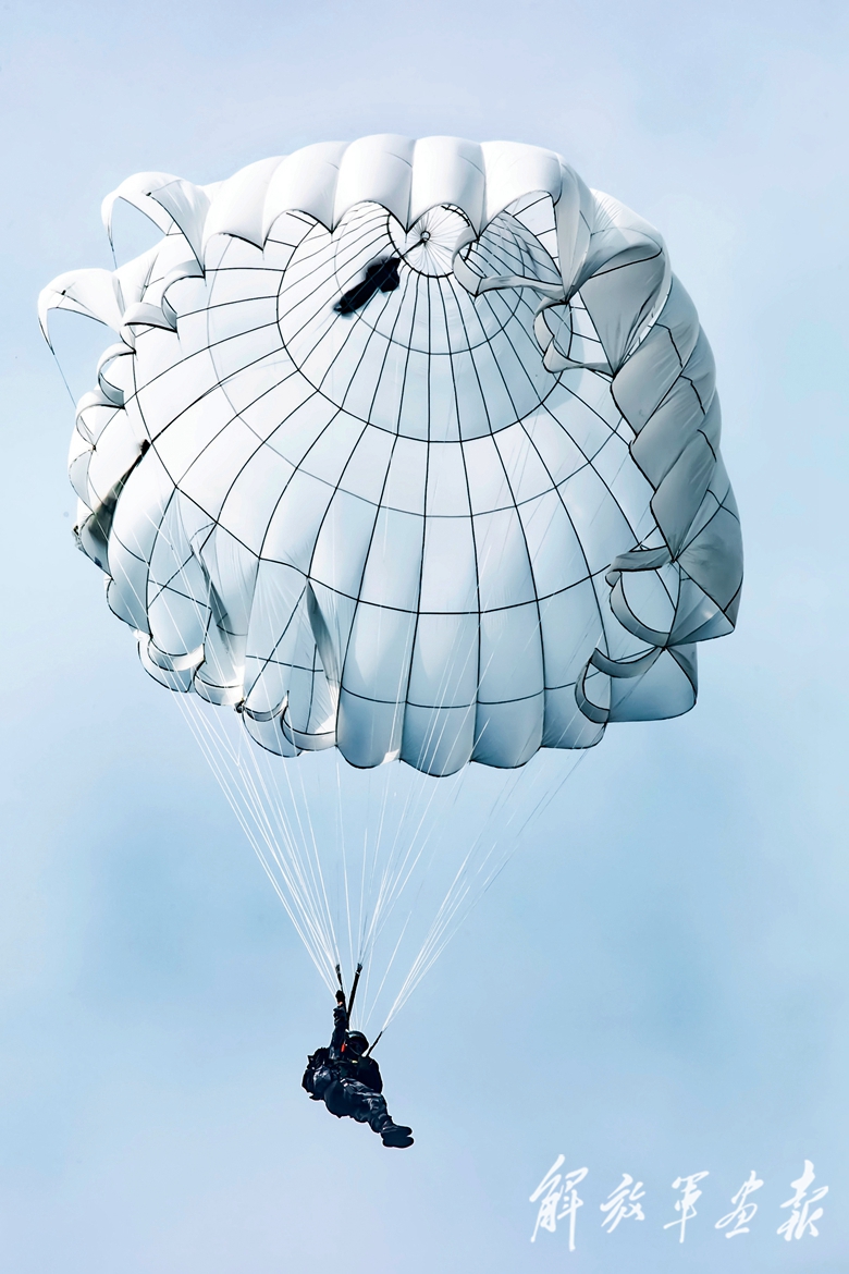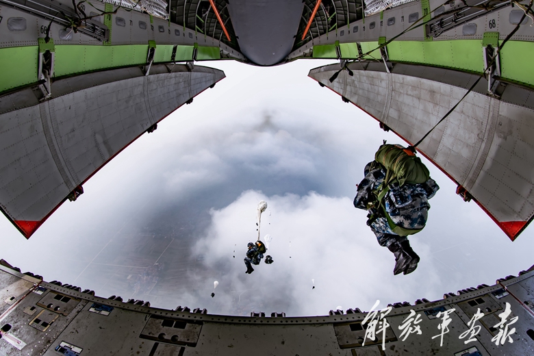 8時(shí)許,伴隨著發(fā)動(dòng)機(jī)的巨大轟鳴聲,數(shù)架滿載傘兵的大型運(yùn)輸機(jī)滑出跑道,呼嘯升空。當(dāng)戰(zhàn)機(jī)飛抵空投空域,艙門打開,跳傘信號(hào)燈亮起,跳傘員依次躍出機(jī)艙,沖向云海。