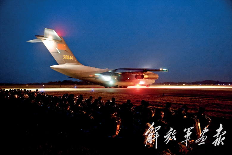 傍晚,轉(zhuǎn)入夜間傘降訓(xùn)練。在濃重的夜色中,戰(zhàn)機(jī)的身影顯得愈發(fā)冷峻。