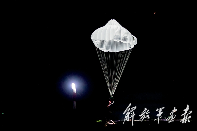 戰(zhàn)機(jī)再次起飛升空。過了一會(huì)兒,朵朵傘花點(diǎn)綴蒼穹,與滿天繁星交相輝映。