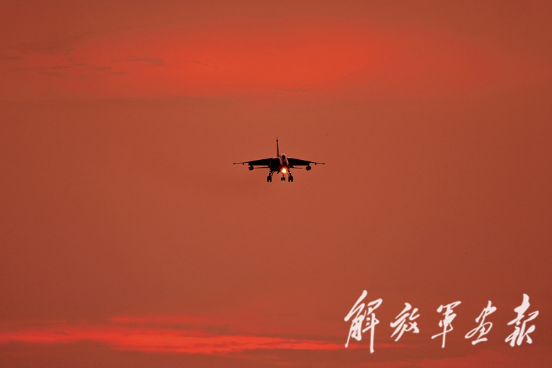 訓(xùn)練結(jié)束后,戰(zhàn)機(jī)在夕陽下返航。