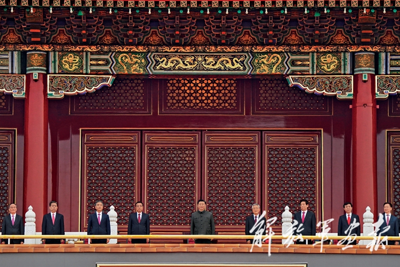 上午7時53分,在歡快的樂曲聲中,習(xí)近平等黨和國家領(lǐng)導(dǎo)人來到天安門城樓主席臺,全場爆發(fā)出熱烈掌聲。