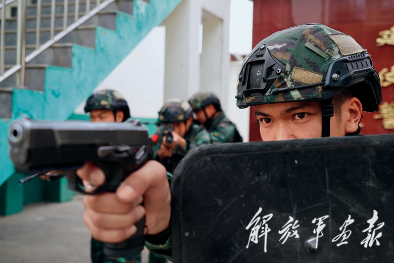 偵察組利用無(wú)人機(jī)和軟管窺鏡等裝備,準(zhǔn)確掌握“暴恐分子”行動(dòng)軌跡和藏匿地點(diǎn);宣傳組開(kāi)展政治攻心,分散“暴恐分子”注意力,瓦解其斗志;突擊組相互掩護(hù),從不同方向隱蔽接近,對(duì)藏匿點(diǎn)實(shí)施包圍;狙擊組占領(lǐng)制高點(diǎn),做好打擊準(zhǔn)備……