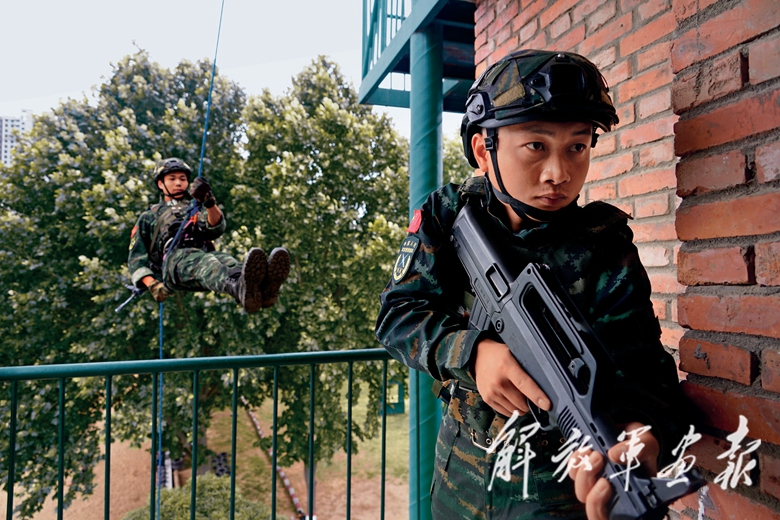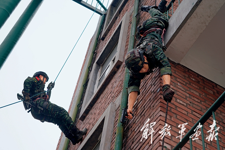 隨著爆震彈一聲巨響,突擊組成功索降突入房?jī)?nèi),將“暴恐分子”全部抓獲,成功解救“人質(zhì)”。
