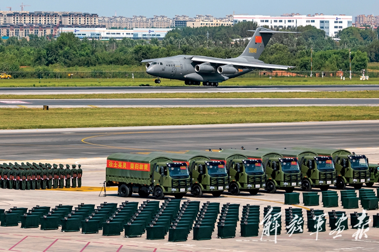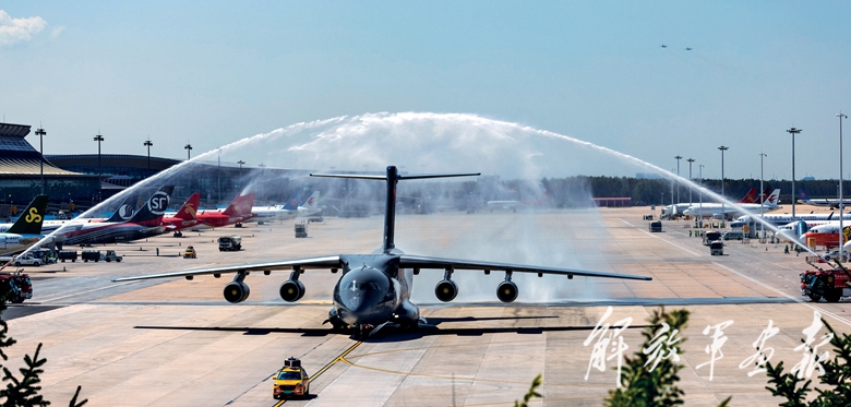 運(yùn)-20專機(jī)滑向停機(jī)位,祖國用最高禮遇“過水門”迎接英烈歸來。(攝影/特約記者 楊 盼)