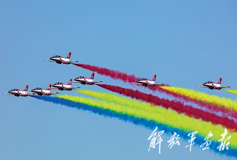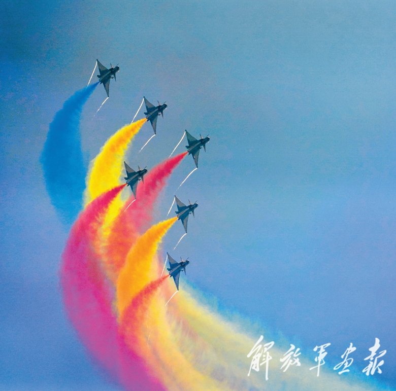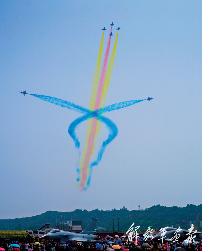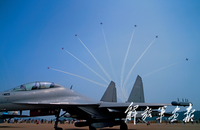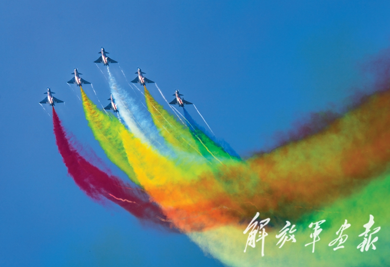 9月28日上午9時(shí)30分,航展正式開幕??哲姟鞍艘弧憋w行表演隊(duì)的6架殲-10表演機(jī)依次升空。五機(jī)水平開花、六機(jī)分組開花等22組特技飛行表演動作精彩絕倫,奏響了本屆航展飛行表演的序曲。