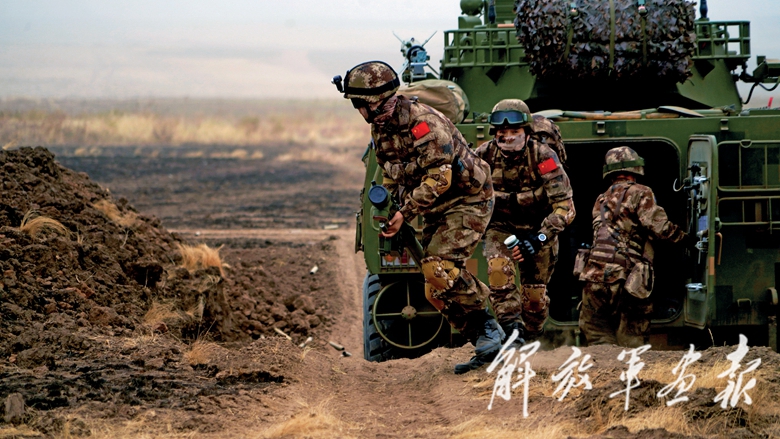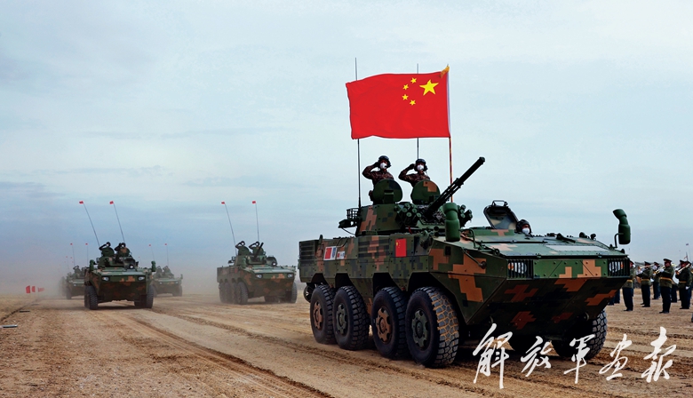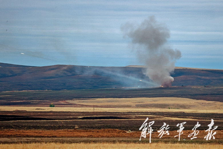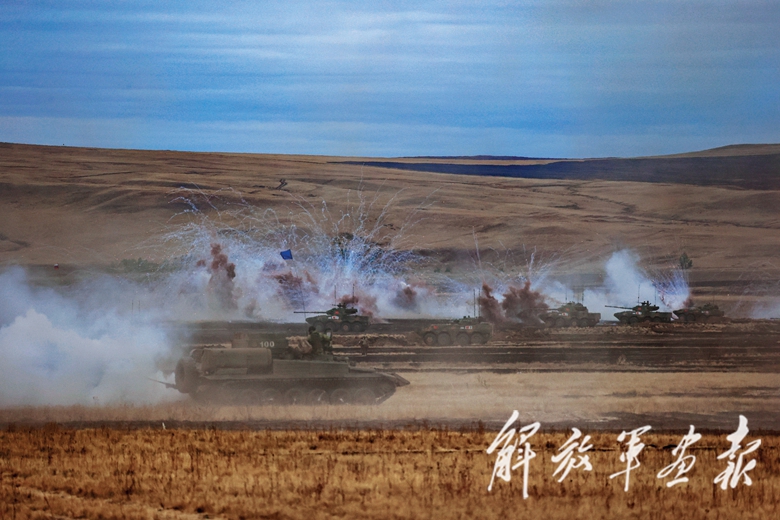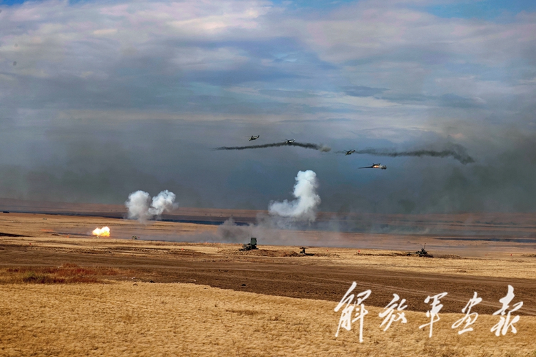 漫天黃沙里,中方地面突擊群迅即前出預(yù)定封鎖線,步戰(zhàn)車、突擊車急速開進(jìn),呈戰(zhàn)斗隊(duì)形向“恐怖武裝”縱深預(yù)定目標(biāo)和前沿陣地展開猛烈攻擊;俄方火箭炮使用半直瞄方式對(duì)“恐怖武裝”的機(jī)動(dòng)火力實(shí)施打擊;多國(guó)聯(lián)合部隊(duì)的榴彈炮、火箭炮齊射,逐個(gè)擊破“恐怖武裝”陣地……