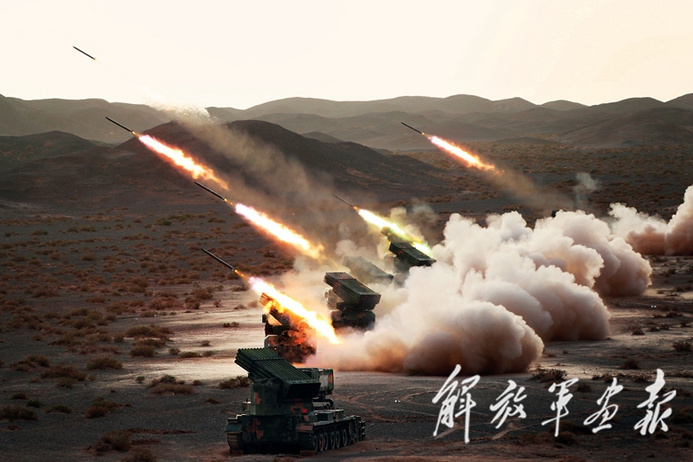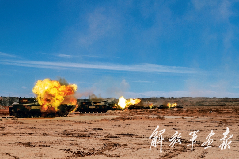 自行火箭炮對目標區(qū)域實施火力覆蓋。