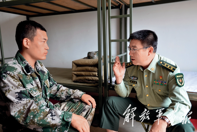 渾南區(qū)人武部政委黃大鵬(右)與穆旭陽談心,及時跟進做思想工作。