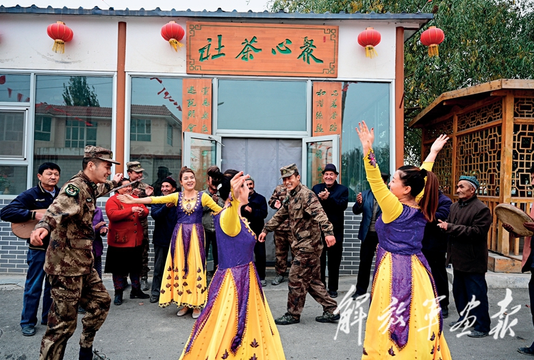 這一天,記者來到阿克蘇市依干其鄉(xiāng)良種尤喀克喬格塔勒村采訪,剛進(jìn)村不久,一行人就被“聚心茶社”傳來的歌聲和歡笑聲所吸引。原來,一場(chǎng)軍民聯(lián)歡活動(dòng)正在進(jìn)行?!敖裉焓莻€(gè)好日子,心想的事兒都能成……”伴著歌曲《好日子》歡快的旋律,軍民一起載歌載舞,抒發(fā)喜悅之情。