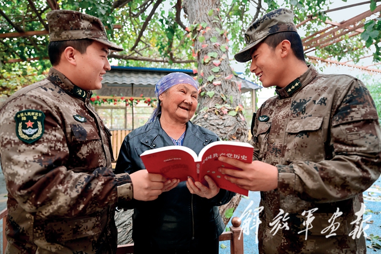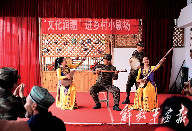 此時(shí),62歲的村民吐魯洪緩步上臺(tái),彈奏起都塔爾(維吾爾族傳統(tǒng)彈弦樂器),伴著悠揚(yáng)的琴聲,唱起自己創(chuàng)作的歌曲。這幾年,在官兵的結(jié)對(duì)幫扶下,吐魯洪家里的生活發(fā)生巨大變化。吐魯洪將自己的感悟?qū)懗筛枨?,通過“聚心茶社”的舞臺(tái)表達(dá)感激之情:“感謝共產(chǎn)黨!感謝解放軍!”