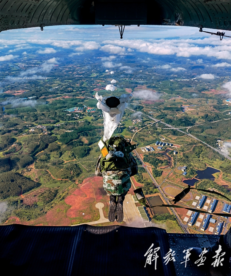 “跳!”隨著投放員一聲令下,學(xué)員們依次躍出艙門。霎時(shí)間,朵朵傘花在天空競(jìng)相綻放。下降過程中,學(xué)員隨時(shí)調(diào)整降落傘狀態(tài),在空中迅速形成兩路隊(duì)形,并不斷修正角度,確保安全精準(zhǔn)著陸。