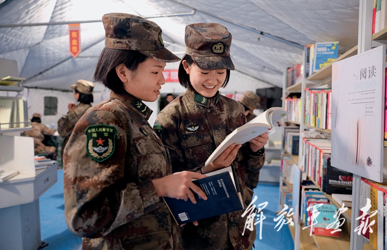 官兵在“戰(zhàn)地書(shū)屋”讀書(shū)。