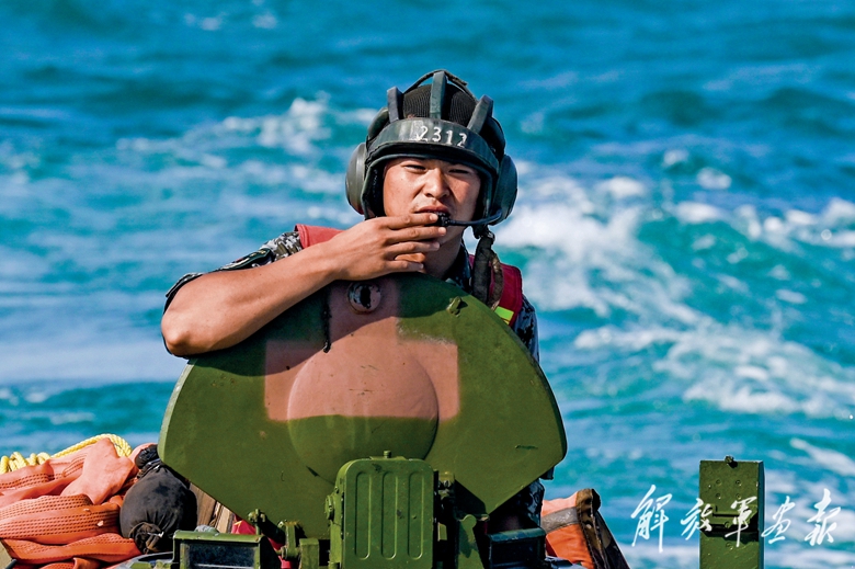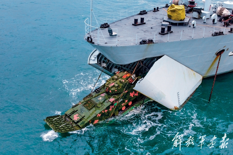 接近登陸艦時,在艦上指揮員的引導下,張勇不時調(diào)整方向,換擋、加油門、轉換工況……瞄準涌浪低潮時機,他操縱戰(zhàn)車快速駛入船艙。首車身后的十余輛戰(zhàn)車不時變換隊形,依次按編組預案駛入登陸艦,完成全浮裝載。