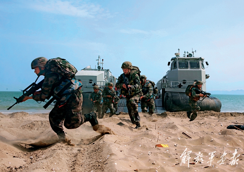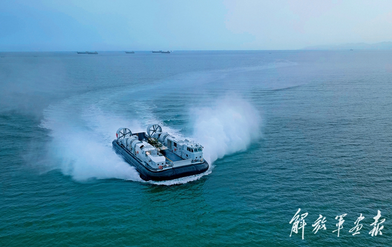 海面上,新型氣墊登陸艇搭載兩棲裝甲分隊一路疾馳,接連突破“敵”多道封鎖,成功突擊上陸。在戰(zhàn)車掩護下,登陸官兵迅速成戰(zhàn)斗隊形搶占進攻陣地。