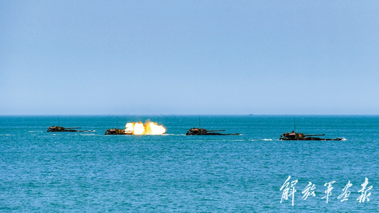 成功處置“火情”后,滿載戰(zhàn)車的艦艇繼續(xù)駛向深海。抵達目標區(qū)域,一輛輛戰(zhàn)車在艦艇的掩護下魚貫駛出登陸艙。經(jīng)過長途泛水編波后,位于前方的幾臺戰(zhàn)車逐漸接近射擊地域。