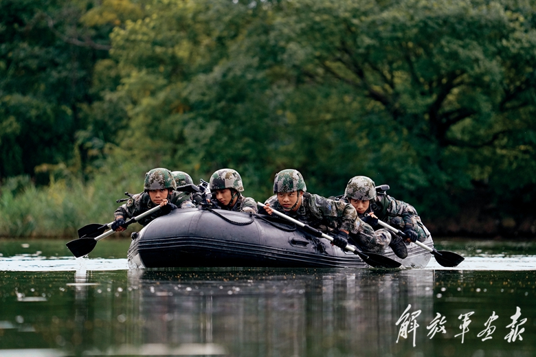 特戰(zhàn)隊(duì)員乘橡皮舟向“敵”陣地隱蔽滲透。