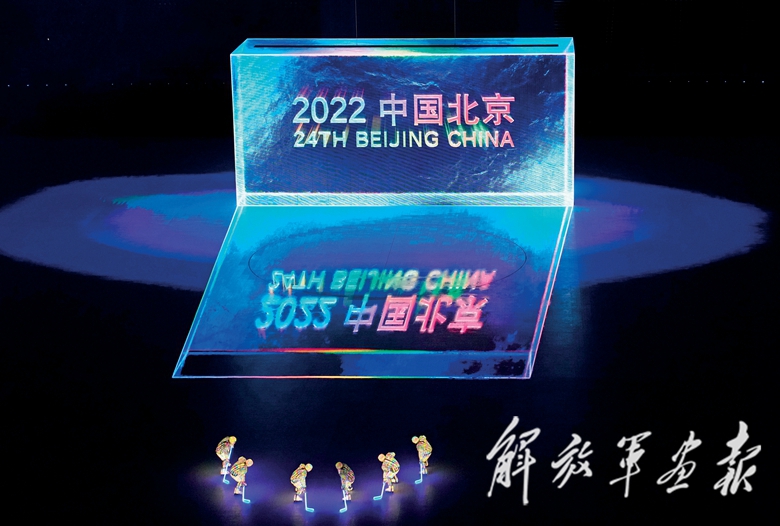 一座巨型冰立方隨著24道“激光刻刀”的雕琢,最終定格為“2022中國北京”。(攝影/新華社記者 孟永民)