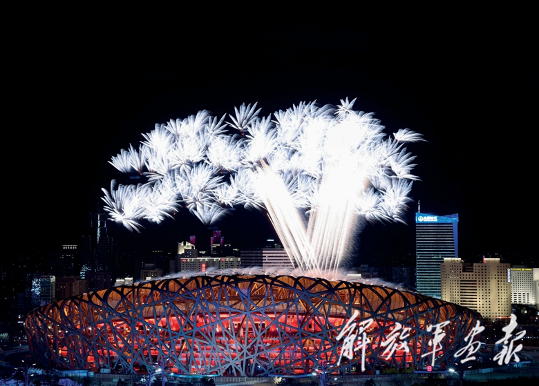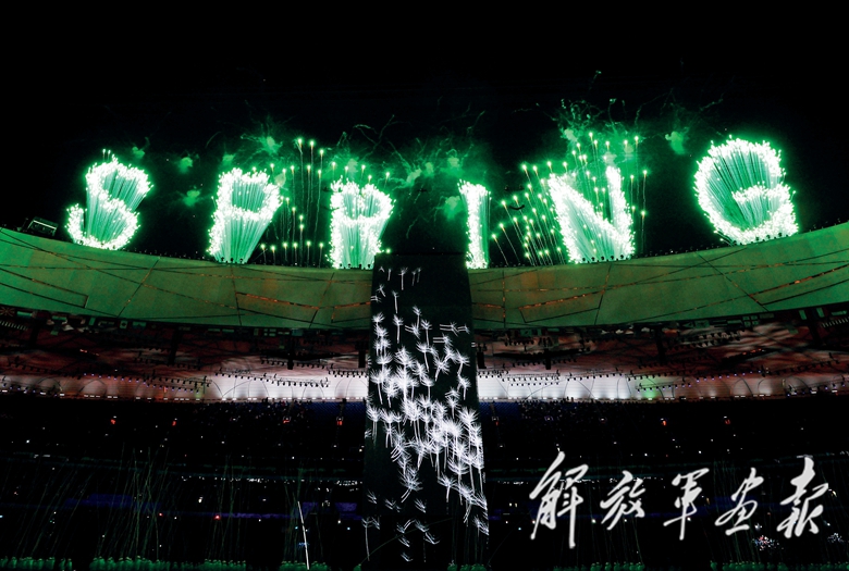 絢麗的焰火點亮鳥巢上空,綻放出“立春”的中英文造型。(攝影/新華社記者 曹 燦)