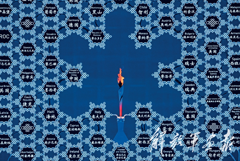 由所有代表團雪花造型引導牌組成的主火炬。(攝影/新華社記者 曹 燦)