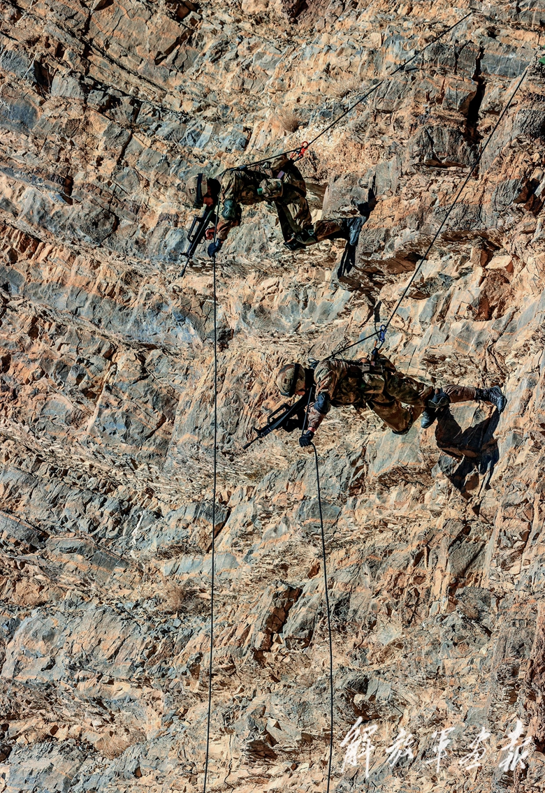 此次訓(xùn)練的重頭戲是崖壁攀登滑降。官兵借助繩索攀爬上近乎垂直的峭壁,既要克服高原缺氧對(duì)人體反應(yīng)速度和身體協(xié)調(diào)性帶來(lái)的不利影響,還要時(shí)刻應(yīng)對(duì)不時(shí)從山頂滑落的碎石。訓(xùn)練場(chǎng)景驚心動(dòng)魄,令記者既捏著一把冷汗,又不由得暗暗為官兵點(diǎn)贊。