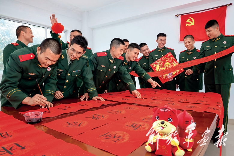 剛和外公視頻通話結(jié)束,高潤(rùn)澤就被戰(zhàn)友們拉去寫(xiě)春聯(lián)。壓紙、蘸墨、起筆、收筆,高潤(rùn)澤的書(shū)法有模有樣?!昂?!雖然你的書(shū)法還不算成熟,但勝在一板一眼,工整認(rèn)真!”指導(dǎo)員許義承的一番點(diǎn)評(píng),令高潤(rùn)澤開(kāi)心不已。此時(shí),官兵們開(kāi)始忙碌起來(lái),掛燈籠、寫(xiě)春聯(lián)、貼“福”字……營(yíng)區(qū)處處洋溢著節(jié)日的氣氛。