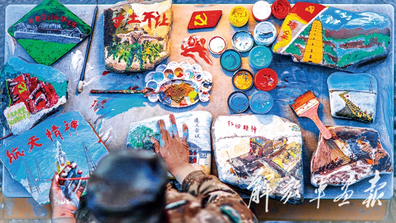 駐訓官兵創(chuàng)作的石繪作品,盡顯愛黨愛國情懷。