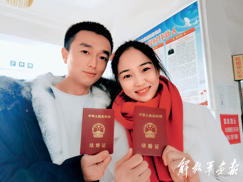 初春,滇中腹地和風(fēng)煦煦、暖意融融。玉溪市民政局大廳內(nèi),新疆軍區(qū)某旅十連指導(dǎo)員謝成宇和東部戰(zhàn)區(qū)海軍某旅勤務(wù)保障連連長(zhǎng)黃旭喜結(jié)連理。至此,這段相隔5200公里、相戀4年的愛情終于修成正果。
