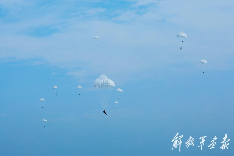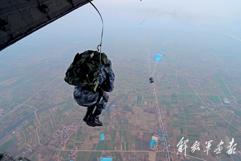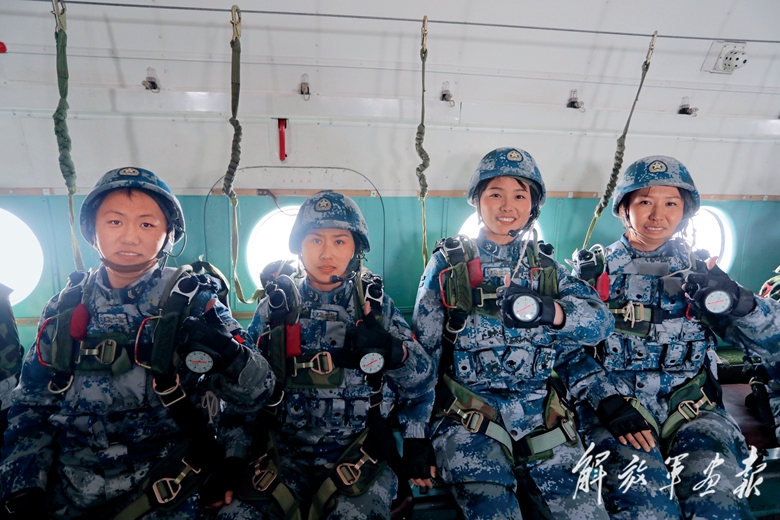 伴隨著戰(zhàn)機轟鳴聲,女兵們背起傘包、檢查裝具、測試電臺,邁著整齊的步伐依次登機。不多時,飛機上升到預定空投位置?!?、2、3,加油!”機艙內,平日性格內向的下士李文瑾主動將手伸了出來,女兵們默契地將手握在一起,互相加油鼓勁。