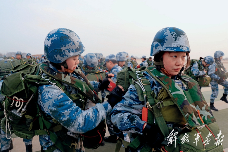 2月下旬的一個清晨,鄂中某地空降兵某旅訓練場,一隊身著迷彩藍的女兵正熱火朝天地整理傘具、披掛裝備,準備展開一場實裝跳傘訓練。