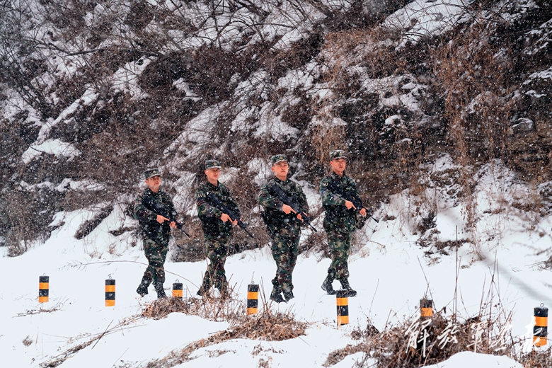 舒成(左一)和戰(zhàn)友們?cè)诼齑笱┲醒策?,確保庫(kù)區(qū)安全。