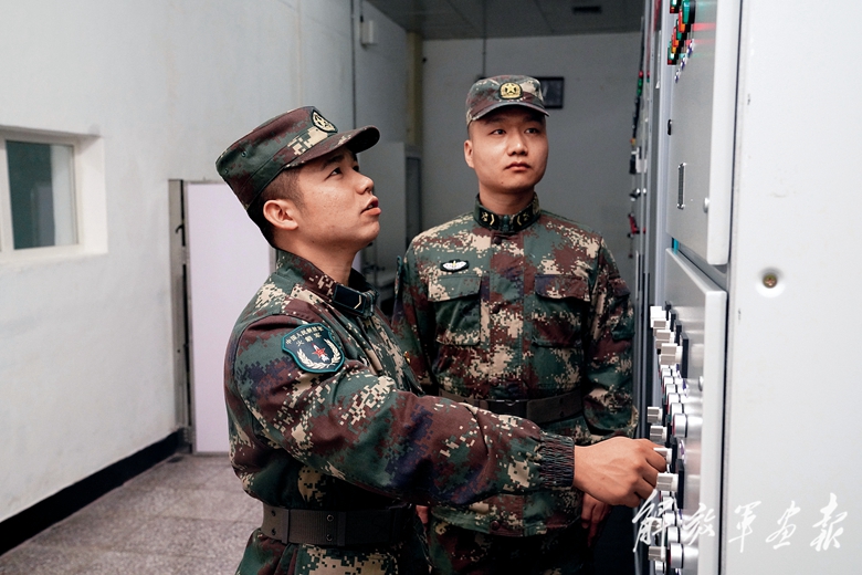 舒成(左)在巡檢中操作陣地設(shè)備。