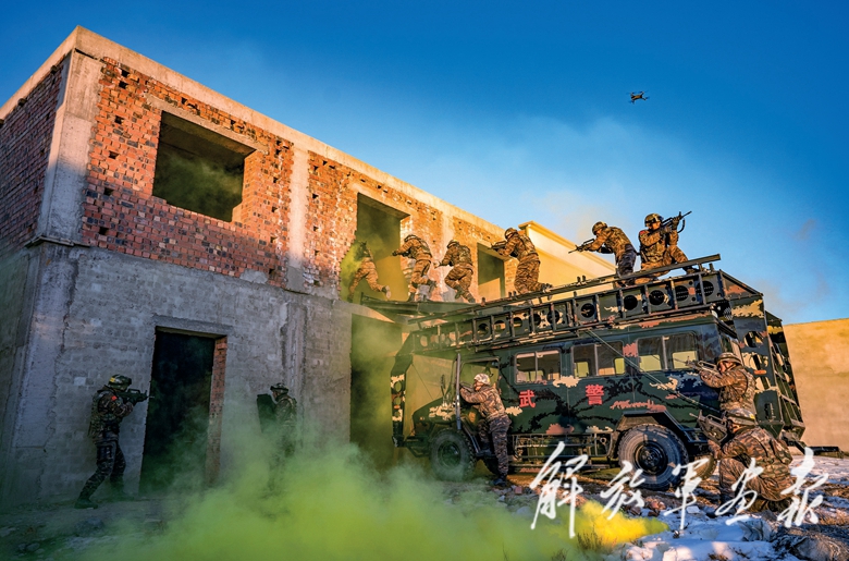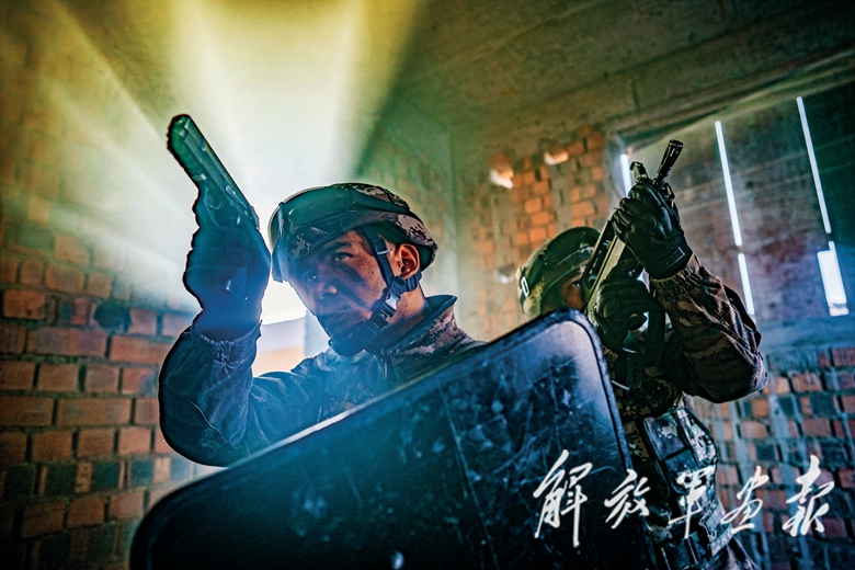 “注意隱蔽!”戰(zhàn)斗小組接近“暴恐分子”占領(lǐng)的廢棄樓房時(shí),一枚燃燒瓶突然破窗而出,隊(duì)員立即相互掩護(hù)。隨后,特戰(zhàn)隊(duì)員利用“敵方”的觀察死角隱蔽接近,占領(lǐng)攻擊位置。接到“武力突擊解救人質(zhì)”命令后,狙擊、偵察、突擊等戰(zhàn)斗小組兵分多路、密切協(xié)同,攜帶專業(yè)裝備從不同方向迅速突入目標(biāo)房屋,將 “暴恐分子”全數(shù)擊斃,成功解救 “人質(zhì)”。