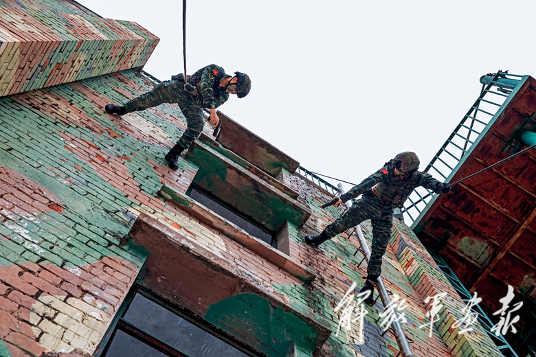 偵察組立即迂回抵近,利用無人機、軟管窺鏡等偵察設(shè)備對廢棄樓進行立體偵察。成功鎖定目標(biāo)后,指揮員當(dāng)機立斷調(diào)整作戰(zhàn)部署,狙擊組尋找制高點伺機實施狙殺;突擊組兵分三路,一路正面佯攻,一路破窗突入,一路從樓頂索降突入。最終,在各組隊員的通力配合下,成功將2名“暴恐分子”制服。