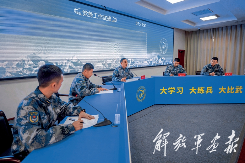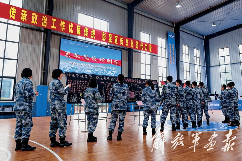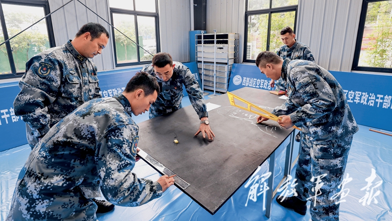 “7月份,飛行訓(xùn)練進(jìn)入旺季,各項(xiàng)重大演訓(xùn)任務(wù)齊頭并進(jìn),人員和裝備都處于高負(fù)荷運(yùn)轉(zhuǎn)狀態(tài)。請(qǐng)召開(kāi)一次黨委會(huì),專(zhuān)題分析訓(xùn)練安全形勢(shì)?!秉h務(wù)實(shí)操考核中,4個(gè)參賽隊(duì)隨機(jī)確定答題順序,各隊(duì)從10名選手中抽取5人召開(kāi)模擬會(huì)議,選取2道題擇一作答;調(diào)查研究實(shí)踐環(huán)節(jié),圍繞“部隊(duì)實(shí)戰(zhàn)化訓(xùn)練情況”“頑癥痼疾清理整治情況”等題目,各隊(duì)分赴駐地不同旅團(tuán)級(jí)單位展開(kāi)實(shí)地調(diào)研,比拼破解發(fā)展難題、解決實(shí)際問(wèn)題的能力;黑板報(bào)比賽現(xiàn)場(chǎng),參賽選手在沒(méi)有手機(jī)網(wǎng)絡(luò)、無(wú)法查找資料的情況下,快速確定主題、設(shè)計(jì)版面、創(chuàng)作文案,運(yùn)用傳統(tǒng)手段開(kāi)展戰(zhàn)時(shí)宣傳鼓動(dòng)……
