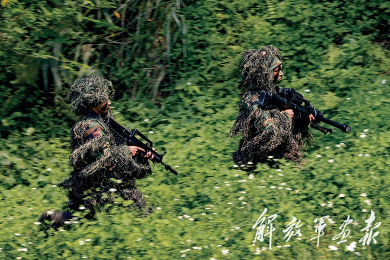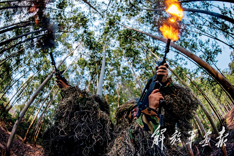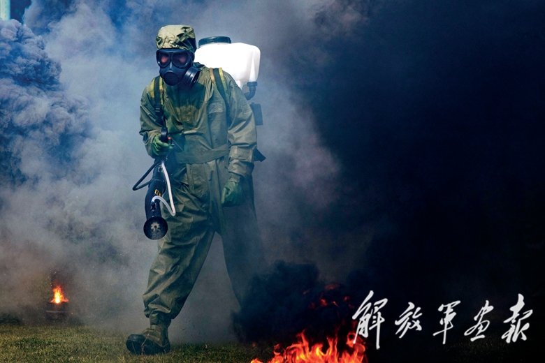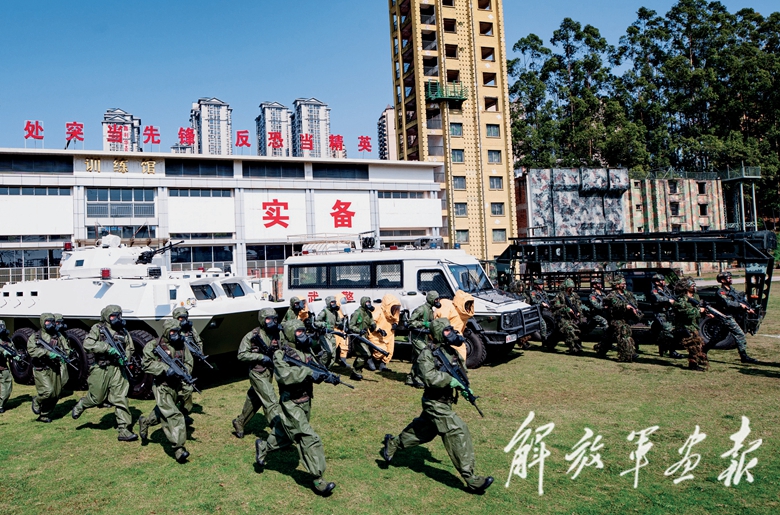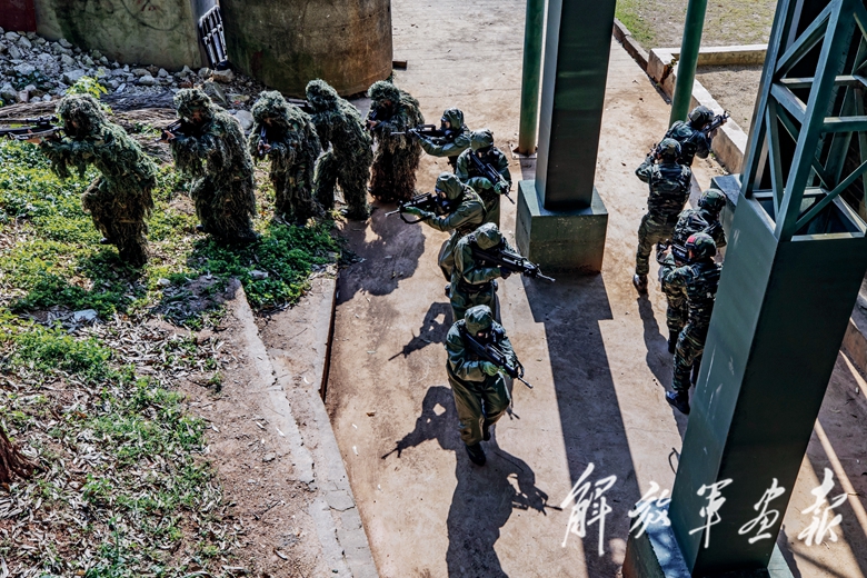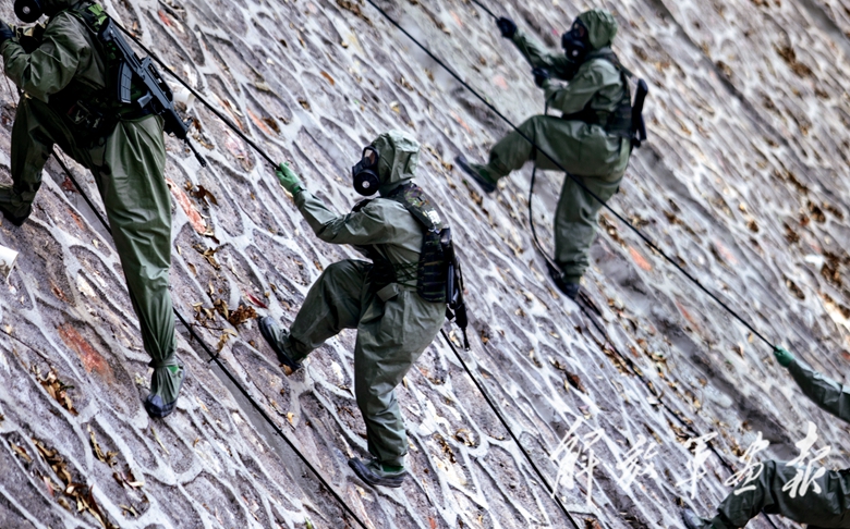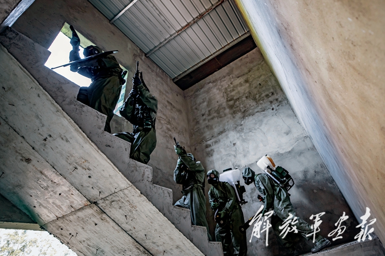 演練剛開(kāi)始,某特戰(zhàn)小隊(duì)接到上級(jí)命令,對(duì)“敵”火力點(diǎn)實(shí)施突擊。正當(dāng)小隊(duì)長(zhǎng)劉興鎮(zhèn)帶領(lǐng)隊(duì)員快速通過(guò)“敵”前沿障礙區(qū)抵近目標(biāo)時(shí),無(wú)人機(jī)操作手張?jiān)K赏蝗粓?bào)告:“前方發(fā)現(xiàn)‘?dāng)场┓糯罅俊卸練怏w’?!?劉興鎮(zhèn)沉著指揮,隊(duì)員快速穿戴防化服后調(diào)整戰(zhàn)斗隊(duì)形,在火力掩護(hù)下,采取靈活戰(zhàn)術(shù)直抵目標(biāo),完成殲滅任務(wù)。