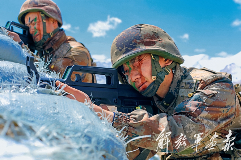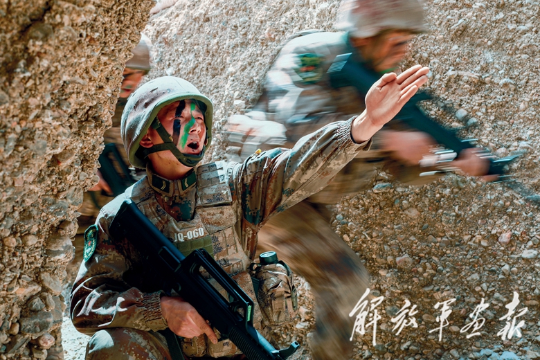 戰(zhàn)術(shù)演練中,楊多林(右一)對(duì)固定目標(biāo)進(jìn)行射擊。