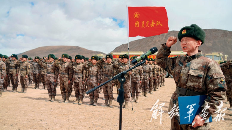 部隊(duì)開展主題團(tuán)日活動(dòng),楊多林(右一)帶領(lǐng)青年官兵宣誓,表達(dá)聽黨指揮、奮斗強(qiáng)軍的堅(jiān)定決心。