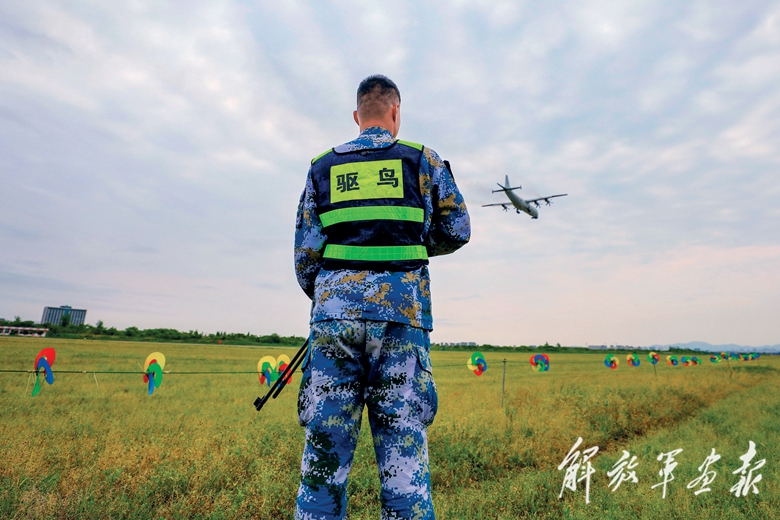 “3號哨位上空出現(xiàn)一只斑鳩,高度100米左右?!本嚅_飛不足10分鐘,對講機里突然傳來通報。下士牛奕凱隨即啟動車載驅(qū)鳥音響,受驚的小鳥很快飛離。不遠(yuǎn)處,下士馬方龍快速燃放鈦雷彈,驚飛一群藏匿在草叢里的麻雀和斑鳩。
