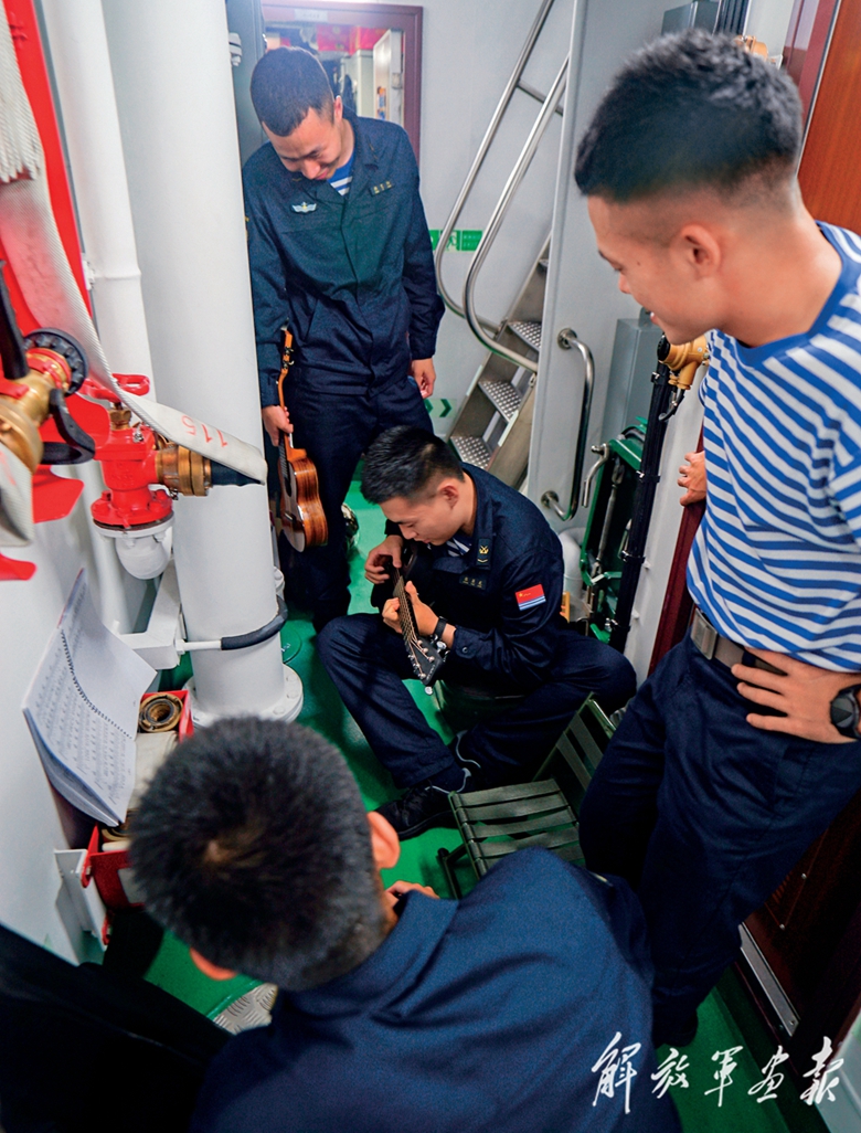 正值周末,吃完晚飯的官兵們難得休閑,各自開(kāi)展娛樂(lè)活動(dòng),打撲克、玩游戲機(jī)、閱讀、健身……在一個(gè)不足60公分寬的過(guò)道里,幾名戰(zhàn)士擠在一起彈吉它,句句歌詞唱出他們的心聲:“是你,多么溫馨的目光,教我堅(jiān)毅望著前路。叮囑我,跌倒不應(yīng)放棄……”