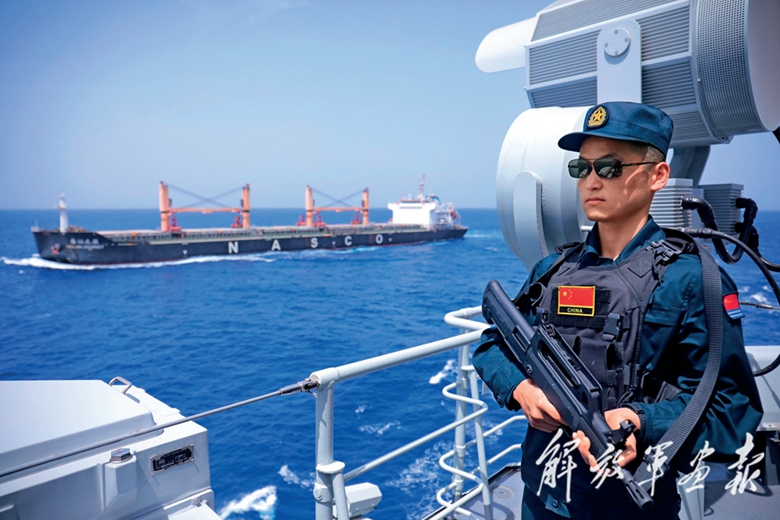 警戒更,全天值更,2小時(shí)輪換。7月的亞丁灣,中午太陽(yáng)正毒。駕駛室旁,李智挺直腰桿、緊握鋼槍,警惕地觀察著海面。茫茫大洋波濤洶涌,李智的目光追隨著正在航行中的外籍商船,沒(méi)有絲毫松懈。海風(fēng)裹挾潮濕的水汽撲來(lái),與他額頭的汗水交織在一起,不斷滾落到嘴唇上,又咸又苦。