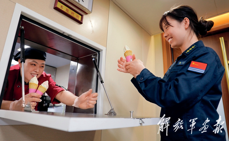 16點(diǎn)40分,蘇州艦響起了“到一餐廳領(lǐng)冰激凌”的廣播?!俺院昧瞬艜?huì)更有戰(zhàn)斗力!”從昨晚開(kāi)始,炊事班和幫廚戰(zhàn)士們加班加點(diǎn),為官兵準(zhǔn)備冰激凌、奶茶、涼粉等一系列年輕人喜愛(ài)的飲品點(diǎn)心。