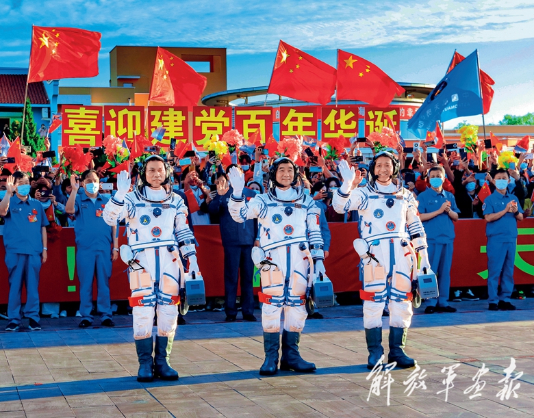 2021年6月17日,神舟十二號(hào)航天員出征儀式在酒泉衛(wèi)星發(fā)射中心舉行,航天員聶海勝(右)、劉伯明(中)和湯洪波準(zhǔn)備出征。(攝影/記者 王衛(wèi)東)