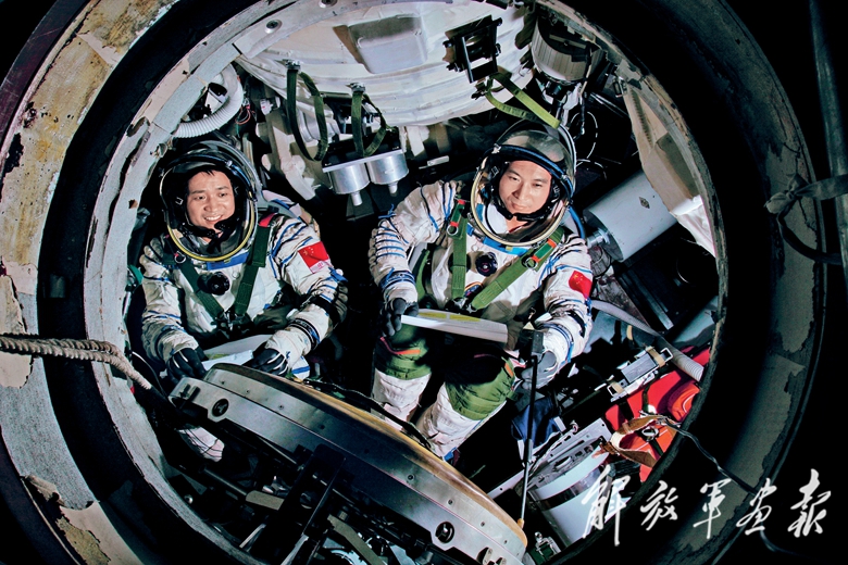 2005年8月27日,航天員聶海勝(左)與費(fèi)俊龍?jiān)谀M返回艙中進(jìn)行陸上出艙訓(xùn)練。(攝影/記者 穆瑞林)