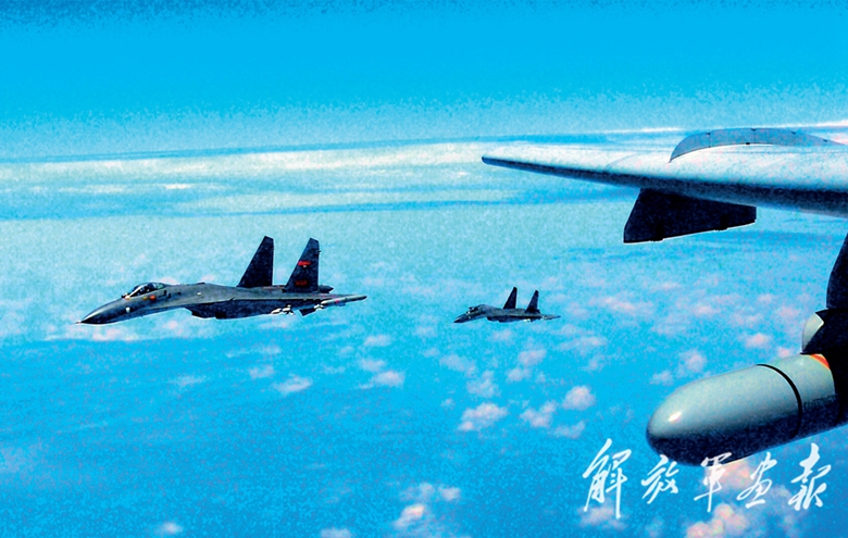 2017年12月,空軍航空兵某團(tuán)繞飛寶島臺灣。兩架轟-6K戰(zhàn)機(jī)飛越宮古海峽、巴士海峽,到達(dá)寶島臺灣東面。飛行員楊勇看到,寶島緊緊依偎在祖國母親身旁。2018年4月,空軍轟-6K、蘇-30、殲-11和偵察機(jī)、預(yù)警機(jī)、加油機(jī)等多型多架戰(zhàn)機(jī),連續(xù)3天開展繞島巡航。不久后,空軍再次實現(xiàn)繞島巡航模式新突破:多架轟-6K戰(zhàn)機(jī)分別從寶島南北兩端同時雙向飛行,預(yù)警機(jī)和殲擊機(jī)前出巴士海峽、宮古海峽實施指揮控制和伴隨掩護(hù)。預(yù)警偵察、轟炸突擊、支援掩護(hù)一體行動,構(gòu)建起海上空中作戰(zhàn)力量體系。