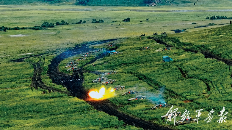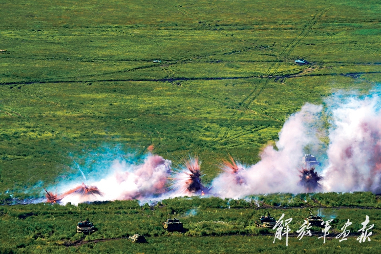 中方參演部隊(duì)與多國參演部隊(duì)陸上力量密切配合,在縱深開進(jìn)中運(yùn)用密集火力有效殺傷前沿和縱深之“敵”,擊潰“敵”濱海聯(lián)合作戰(zhàn)部隊(duì)主力集群。