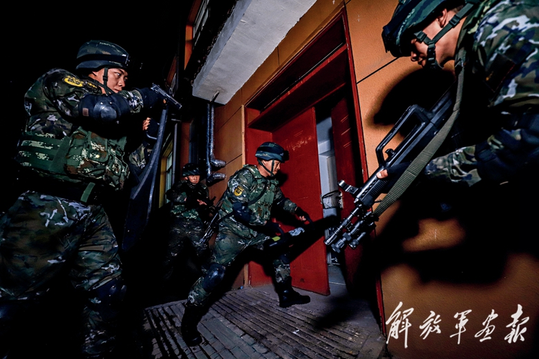 “行動!”隨著現(xiàn)場指揮員一聲令下,在狙擊組和偵察組的默契配合下,突擊組交替掩護,迅速向居民房發(fā)起強攻,一舉將“暴恐分子”殲滅。