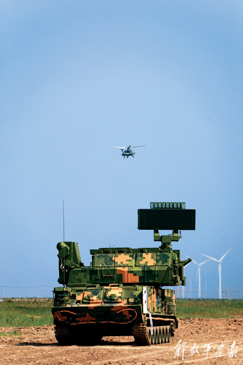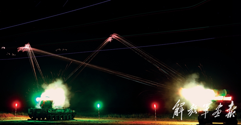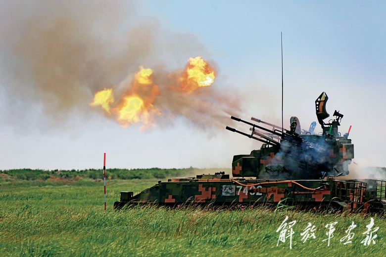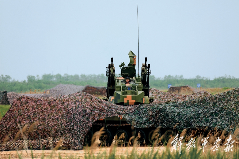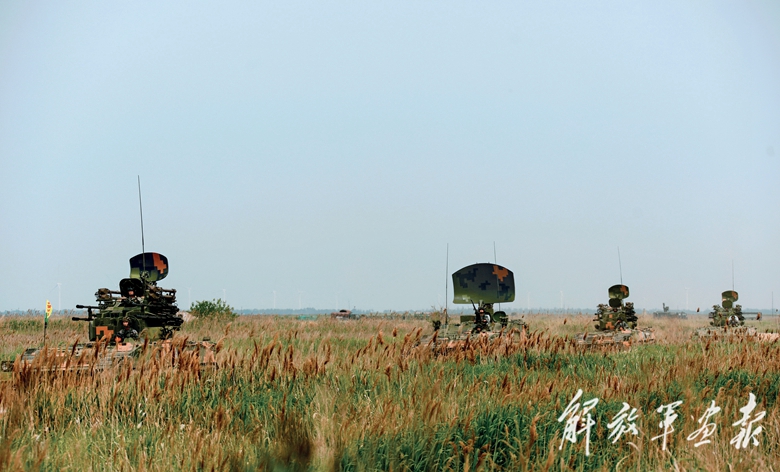 面對(duì)突發(fā)情況,各個(gè)防空陣地共享“敵情”信息,20余輛防空戰(zhàn)車(chē)按照“彈炮結(jié)合”的打擊編組,梯次攔截來(lái)襲“敵機(jī)”,撕裂“敵”機(jī)群陣型,并以密集火力將其殲滅。