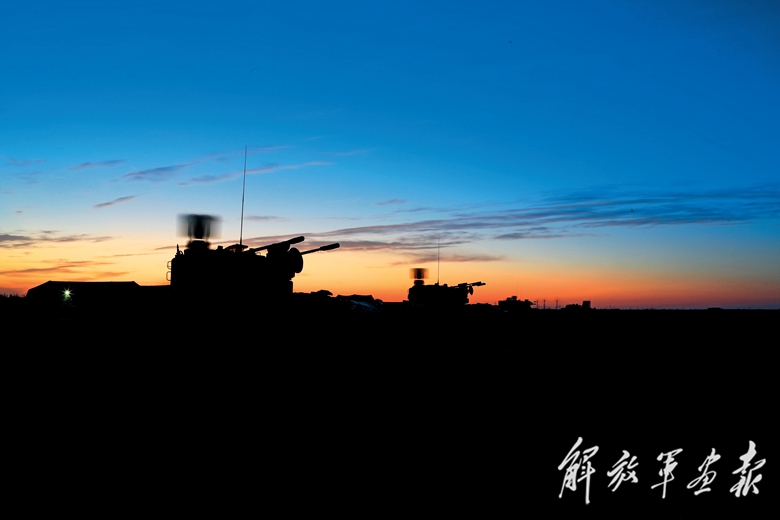 皓月隱去,旭日東升,經(jīng)過(guò)“戰(zhàn)火”洗禮的陣地寂靜下來(lái),官兵們稍事休息。突然,一陣刺耳的防空警報(bào)響起,“敵機(jī)”正快速向防空陣地襲來(lái)。