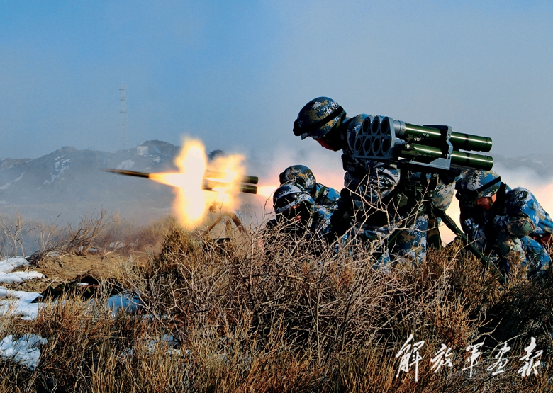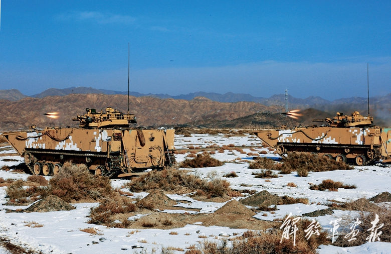 2016年1月,海軍陸戰(zhàn)隊赴新疆開展寒訓。圖為在多兵種協(xié)同演練中,車載反坦克導彈實彈射擊。(攝影/尚文斌)