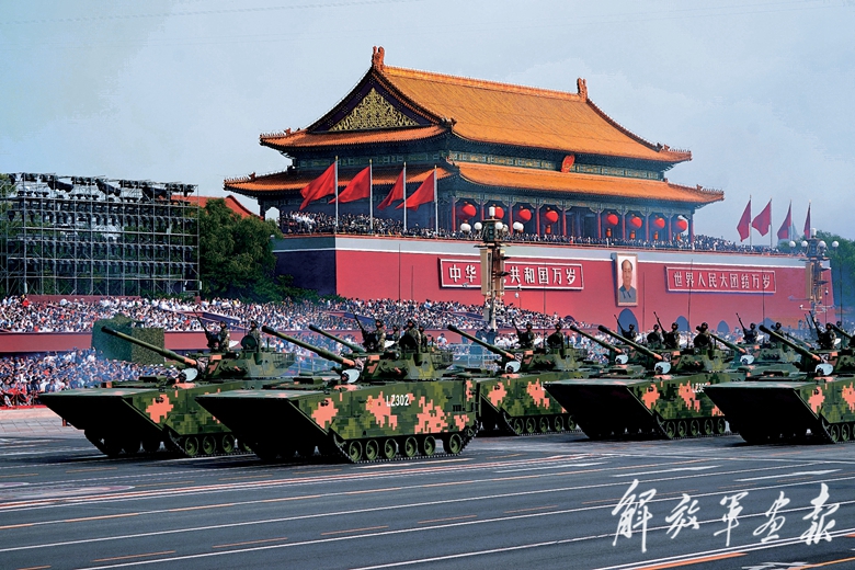 在慶祝新中國成立70周年閱兵式上,由海軍陸戰(zhàn)隊抽組而成的兩棲突擊車方隊接受檢閱。(攝影/程 敏)